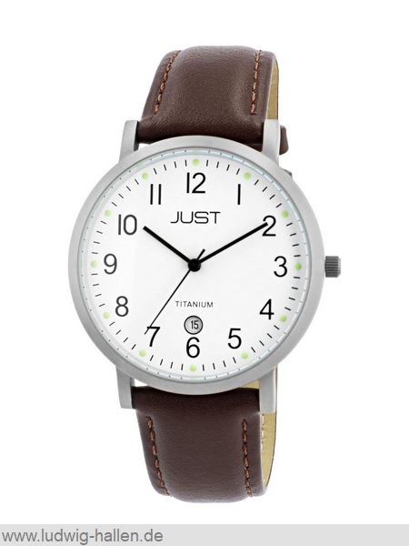 JUST JU20041-003 4049096657800 / Modell Keenan, Titangehäuse (Durchmesser 40 mm, Höhe 9 mm), Mineralglas, Lederband mit Dornschließe (Breite 20 mm), Datum, 5 ATM druckgeprüft, Gesamtlänge 22 cm / 59.95 €uro