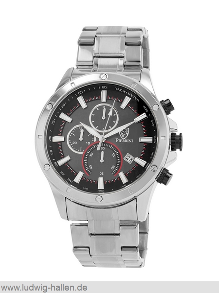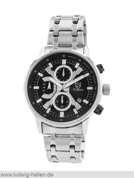 PIERRINI 2800122-001 4068532057035 / Metallgehäuse ionenplattiert mit Edelstahlboden (Durchmesser 46.7 mm, Höhe 12.3 mm), Mineralglas, Edelstahlband ionenplattiert mit Butterfly-Schließe (Breite 24 mm), Chronograph (Zwischenzeit), Leuchtzeiger und -indizes, Datum, 3 bar wasserdicht / 59.- €uro