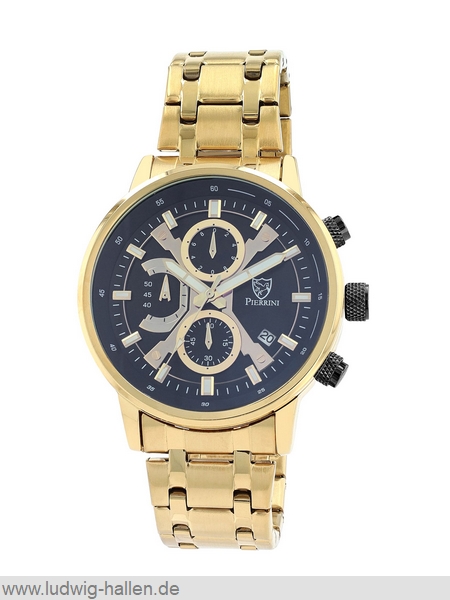 PIERRINI 2800122-005 4068532057073 / Metallgehäuse ionenplattiert mit Edelstahlboden (Durchmesser 46.7 mm, Höhe 12.3 mm), Mineralglas, Edelstahlband ionenplattiert mit Butterfly-Schließe (Breite 24 mm), Chronograph (Zwischenzeit), Leuchtzeiger und -indizes, Datum, 3 bar wasserdicht / 59.- €uro