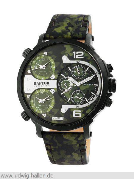 RAPTOR RA20130-016 4049096939333 / Limited-Serie, Modell Maxx, Metallgehäuse mit Edelstahlboden (Durchmesser 52 mm, Höhe 13 mm), Mineralglas, Lederband mit Dornschließe (Breite 24 mm), 4 Zeitzonen, 24 Stundenanzeige, Datum, 3 bar wasserdicht, Gesamtlänge 26 cm / 99.95 €uro