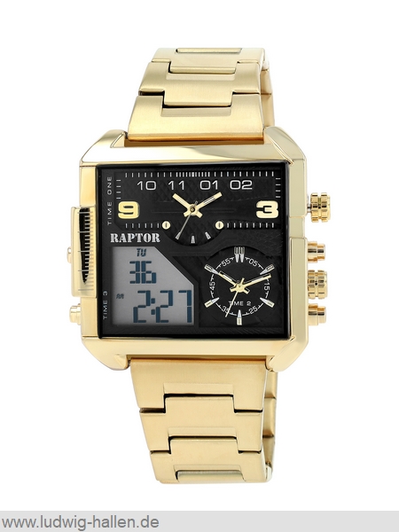 RAPTOR RA20312-001 4049096887856 / Modell Sportsmen, Metallgehäuse mit Edelstahlboden (Durchmesser 48 mm, Höhe 15 mm), Mineralglas, Silikonband mit Dornschließe (Breite 24 mm), Analog-Digital-Anzeige (Beleuchtung, Dualzeit, Tag, Datum, Stoppuhr, Alarm), Leuchtzeiger und -indizes, 5 bar wasserdicht, Gesamtlänge 26.5 cm / 49.95 €uro