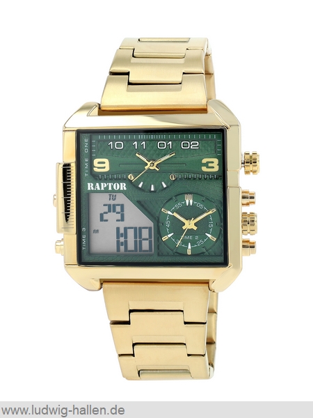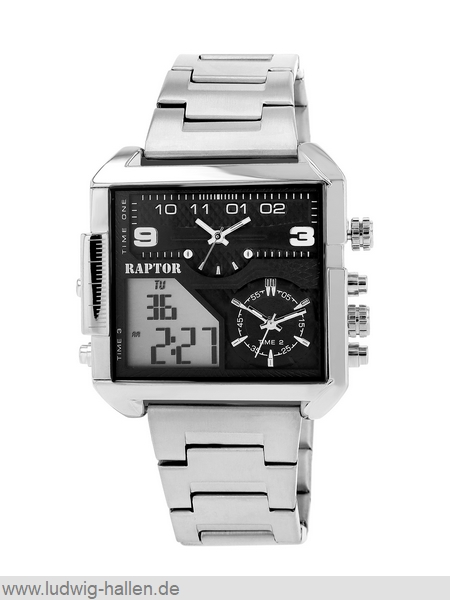 RAPTOR RA20387-003 4068532021456 / Modell Domian, Metallgehäuse mit Edelstahlboden (Breite 48 mm, Länge 50 mm, Höhe 14 mm), Mineralglas, Edelstahlband mit Faltschließe und Sicherheitsdrückern (Breite 28 mm), 2 Analog-Digital-Anzeige (Beleuchtung, Tag, Datum, Stoppuhr, Alarm), Leuchtzeiger, 3 bar wasserdicht, Gesamtlänge 24 cm / 59.95 €uro