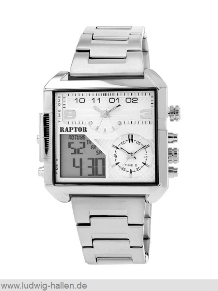 RAPTOR RA20387-002 4068532021449 / Modell Domian, Metallgehäuse mit Edelstahlboden (Breite 48 mm, Länge 50 mm, Höhe 14 mm), Mineralglas, Edelstahlband mit Faltschließe und Sicherheitsdrückern (Breite 28 mm), 2 Analog-Digital-Anzeige (Beleuchtung, Tag, Datum, Stoppuhr, Alarm), Leuchtzeiger, 3 bar wasserdicht, Gesamtlänge 24 cm / 59.95 €uro