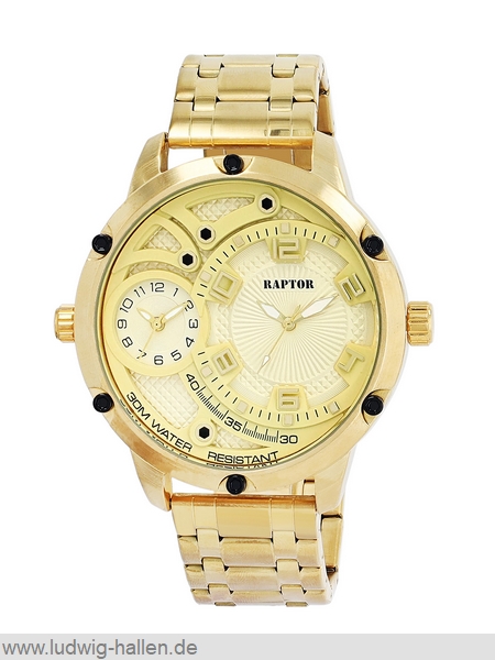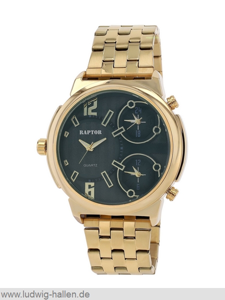 RAPTOR RA20388-004 4068532021517 / Modell Lucius, Metallgehäuse mit Edelstahlboden (Durchmesser 53 mm, Höhe 14 mm), Mineralglas, Edelstahlband mit Faltschließe und Sicherheitsdrückern (Breite 26 mm), 3 Zeitzonen, Leuchtzeiger, 3 bar wasserdicht, Gesamtlänge 25 cm / 59.95 €uro