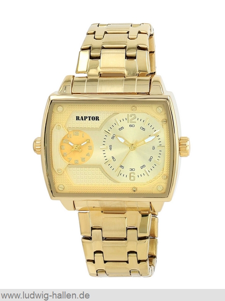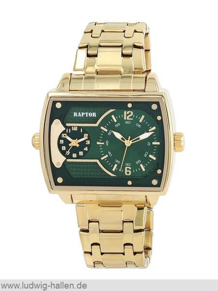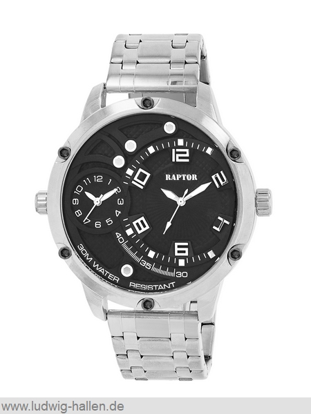 RAPTOR RA20389-004 4068532021579 / Modell Magnus, Metallgehäuse mit Edelstahlboden (Breite 48 mm, Länge 58 mm, Höhe 13 mm), Mineralglas, Edelstahlband mit Faltschließe und Sicherheitsdrückern (Breite 26 mm), Chronolook, 2 Zeitzonen, Leuchtzeiger, 3 bar wasserdicht, Gesamtlänge 24.5 cm / 59.95 €uro