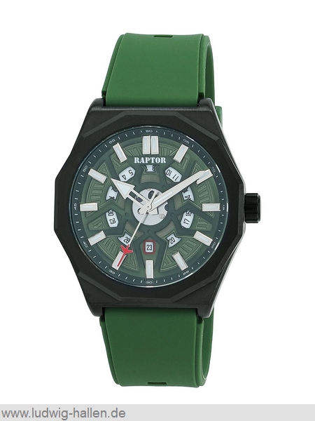 RAPTOR RA20362-002 4049096935472 / Limited-Serie, Modell Fillip, Metallgehäuse mit Edelstahlboden (Durchmesser 45 mm, Höhe 12 mm), Mineralglas, Silikonband mit Dornschließe (Breite 22 mm), 24 Stundenanzeige, Datum, Wochentag, Leuchtzeiger und -indizes, 2 Zeitzonen, 3 bar wasserdicht, Gesamtlänge 27 cm / 79.95 €uro