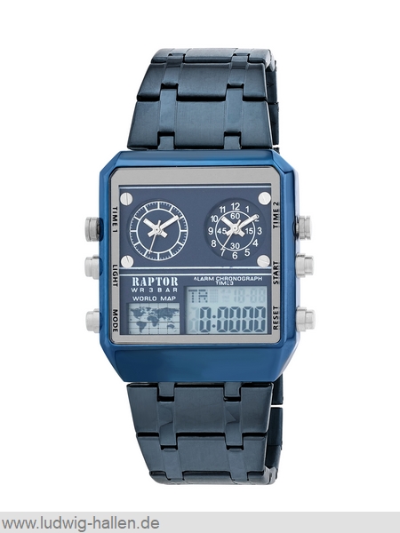 RAPTOR RA20306-003 4049096887511 / Modell Rafe, Metallgehäuse mit Edelstahlboden (Durchmesser 47 mm, Höhe 16 mm), Mineralglas, Edelstahlband mit Faltschließe und Sicherheitsdrückern sowie -bügel (Breite 22 mm), Analog-Digital-Anzeige (Beleuchtung, Dualzeit, Tag, Datum, Stoppuhr, Alarm), Leuchtzeiger und -indizes, 5 bar wasserdicht, Gesamtlänge 21 cm / 59.95 €uro